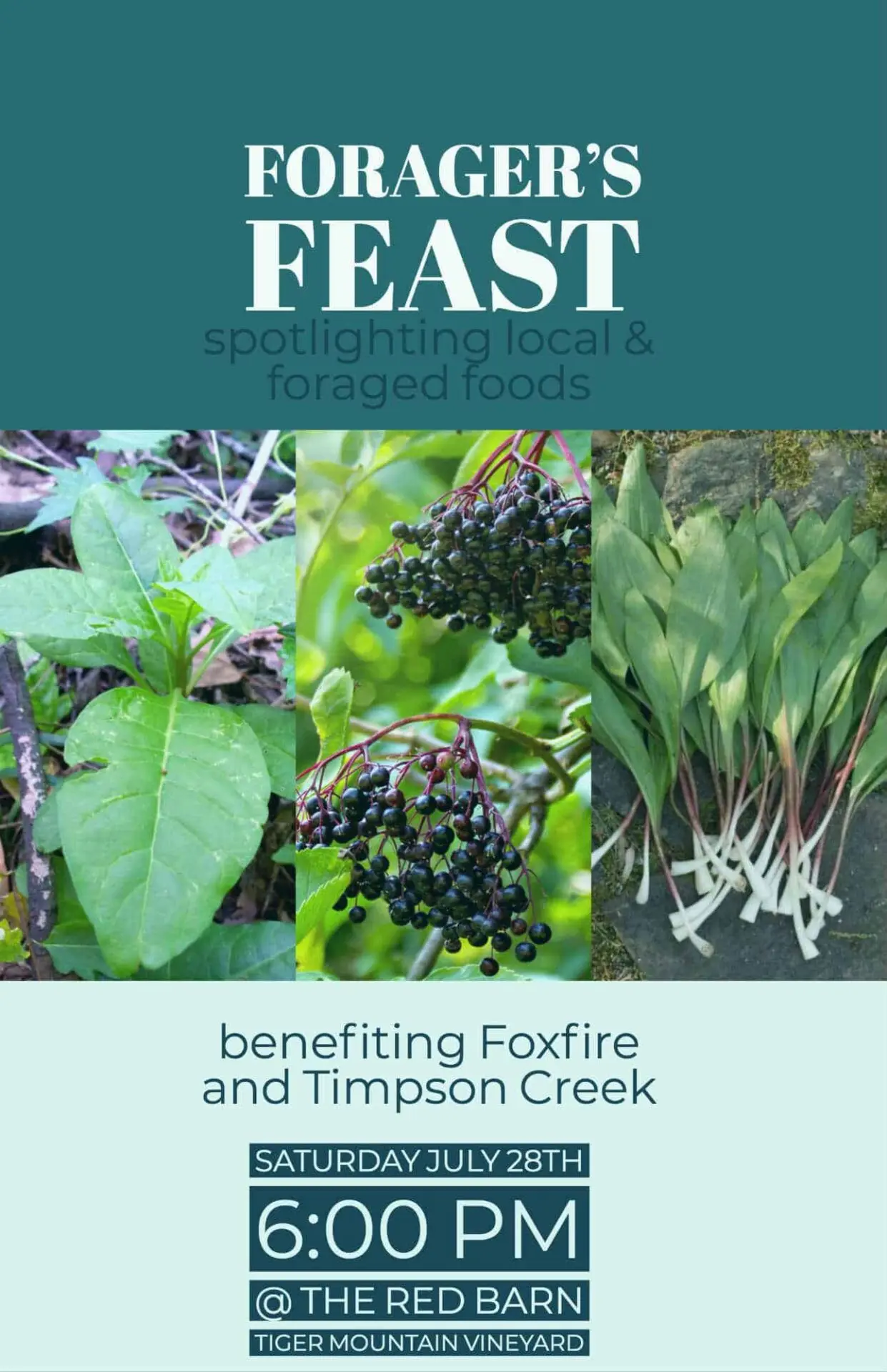 Join us for a dinner to benefit Foxfire and Timpson Creek Farm at Tiger Mountain Vineyard’s Red Barn. We have prepared an evening of tastes from Southern Appalachia. Leading this culinary journey are chef David Sweeny, wild foods experts Patricia Kyritsi Howell (BotanoLogos School of Herbal Studies) and Cara Lee Langston (Wildcraft Kitchen), and Darby Weaver, farm manager for Timpson Creek Farm. Throughout the evening, Foxfire educators and students will share images and interviews from its archives about wild foods and their role in Southern Appalachian. Foxfire and Timpson Creek Farm will share how they are collaborating to raise awareness about local foodways in order to revive and reclaim food traditions in the region.