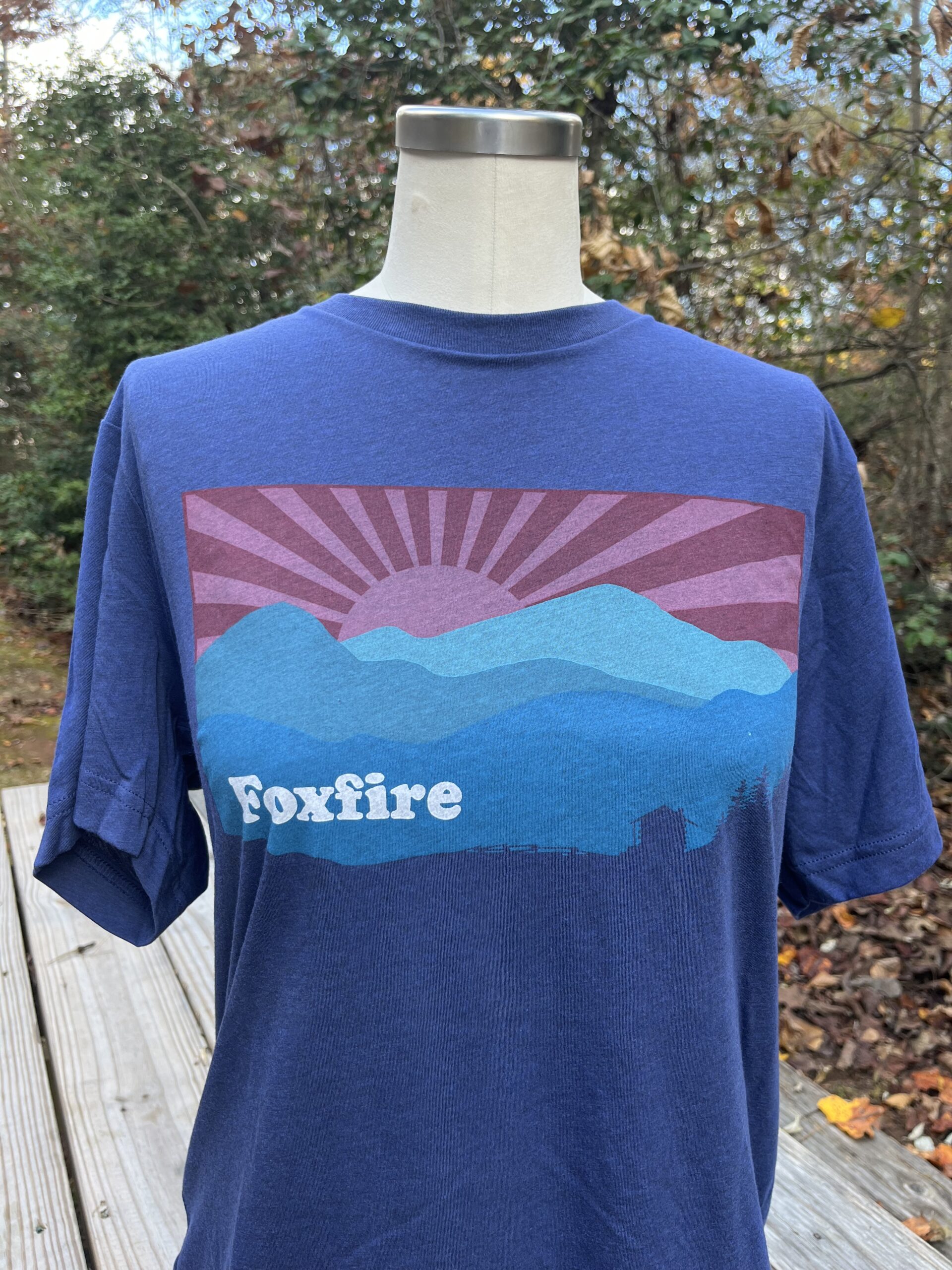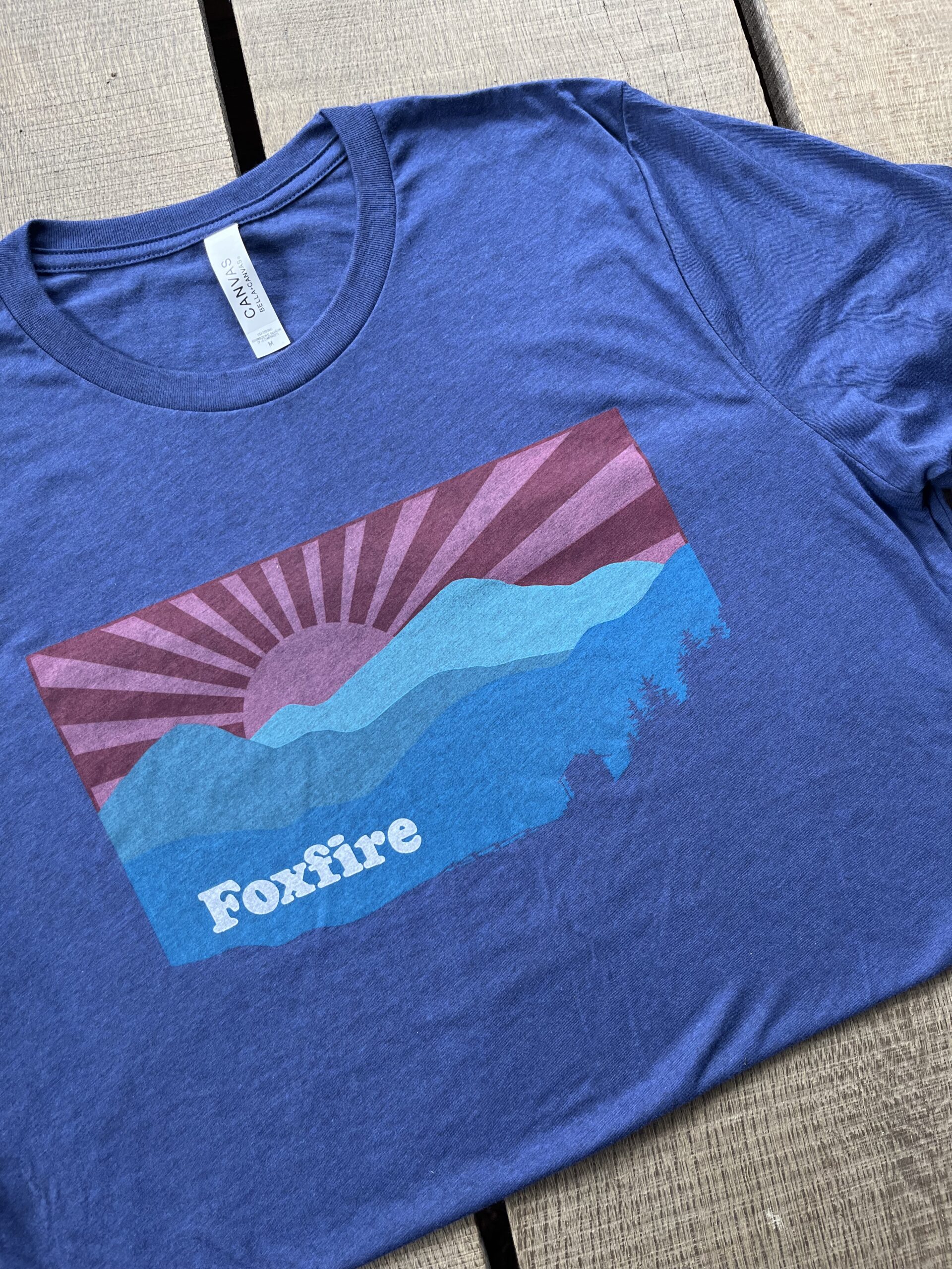 This t-shirt captures the beauty of a Blue Ridge sunset, home of the Foxfire Museum. Featuring mountains and even the outline of a cabin, this unique design will bring color to any outfit! Made in the USA.